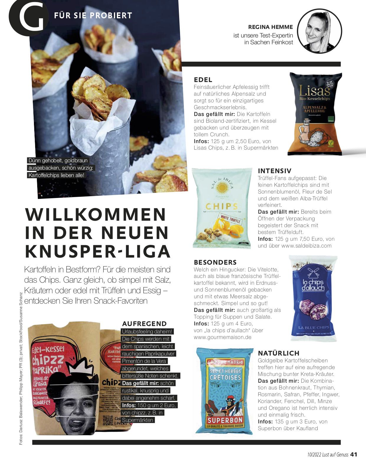Magazin "Lust auf Genuss" aus dem Burda-Verlag Ausgabe Nummer 10 des Magazins „Die neue Kartoffelküche” Artikel mit dem Titel : „Willkommen in der neuen Knusperliga” Redakteurin Regina Hemme,